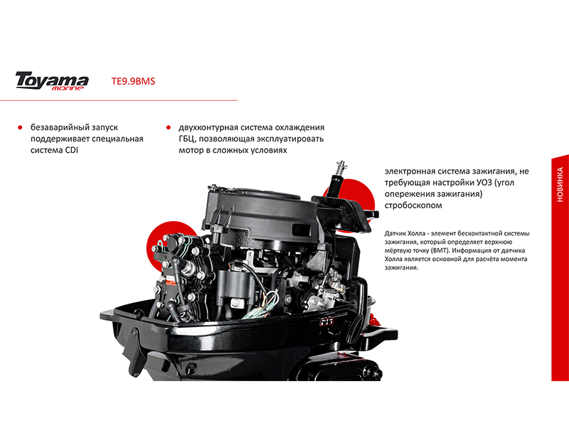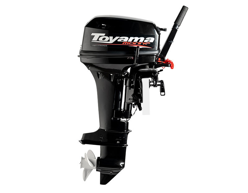 Toyama TE9.9BMS Enduro - Мощность двигателя - 9.9 ~ 15 л.с. с объемом двигателя 246 см3 не требует регистрации в ГИМС МЧС. Отличается от обычного мотора Т9.9 электронной системой опережения зажигания, усиленным румпелем и кожухом двигателя, улучшенной системой охлаждения, новой усовершенствованной конструкцией карбюратора. Предназначен для эксплуатации в условиях повышенной сложности и нагрузки; ранее поставлялся как Тояма T18BMS.